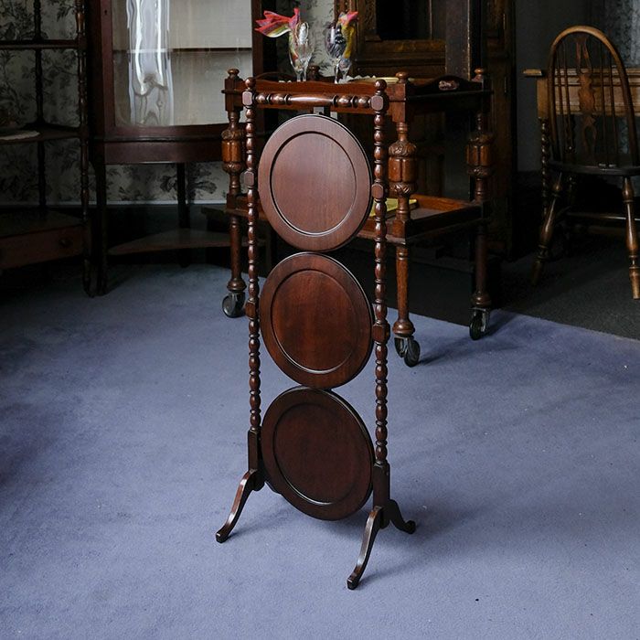 イギリス・英国アンティーク家具「マホガニー製ボビンフレーム3段フォールディングケーキスタンド」です。