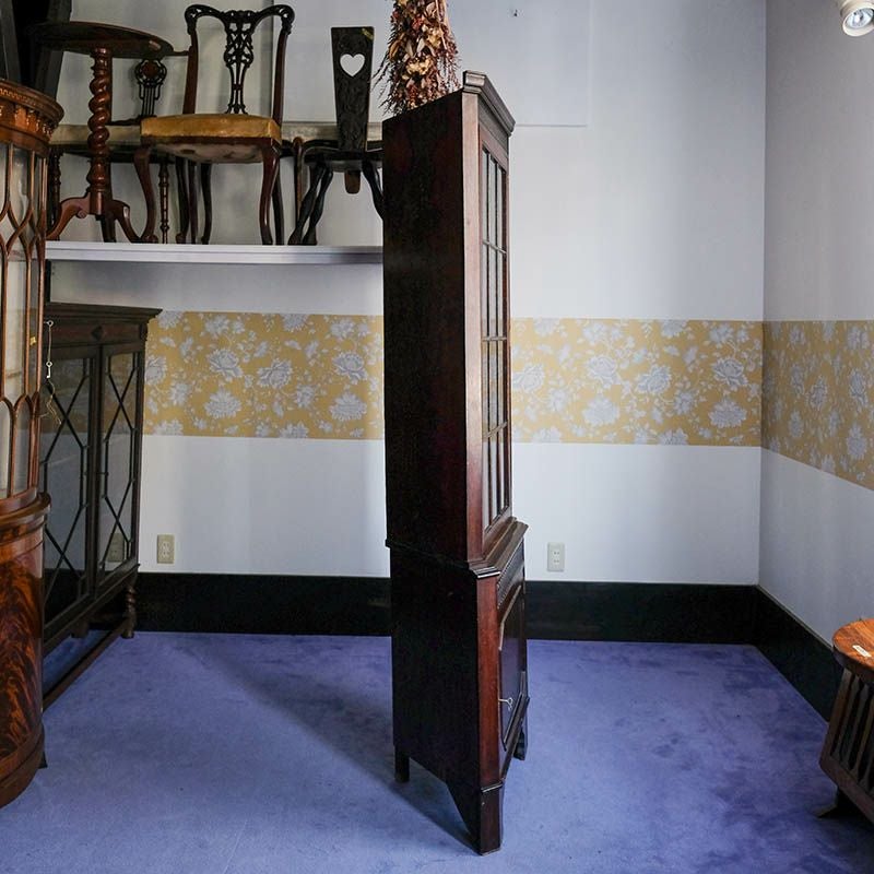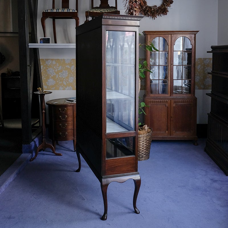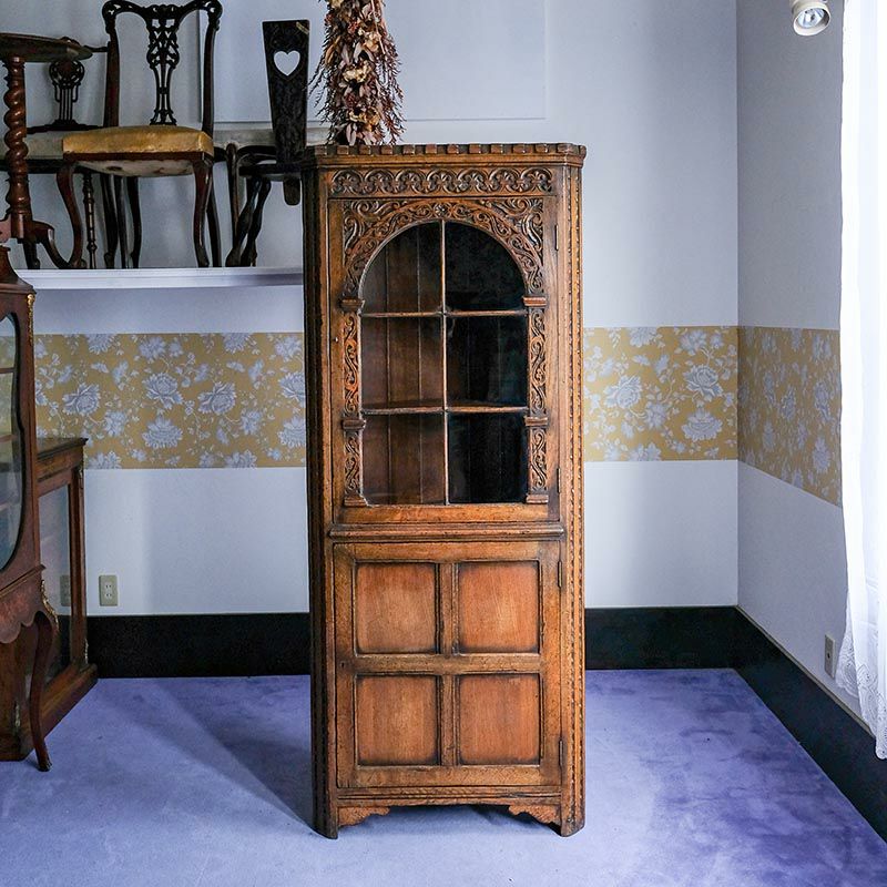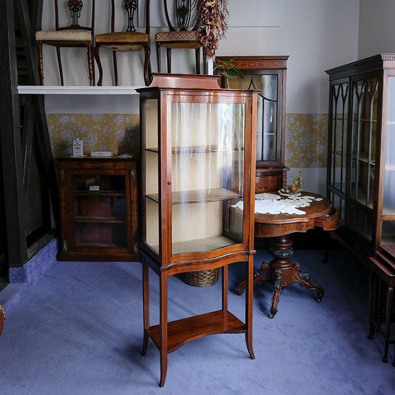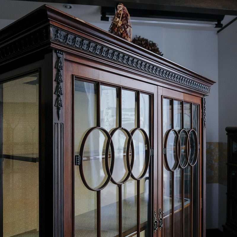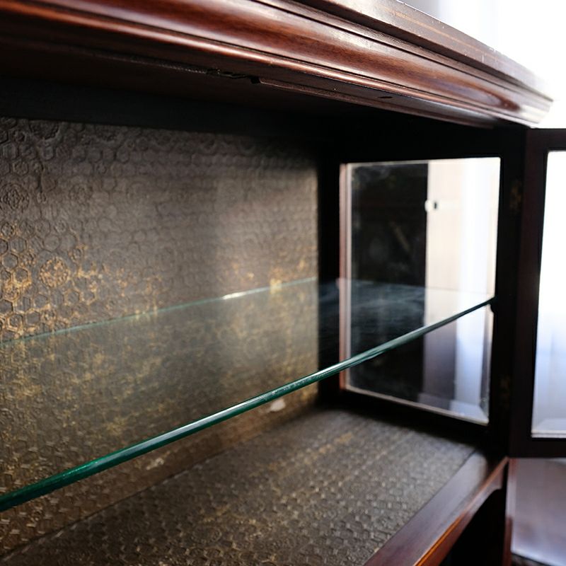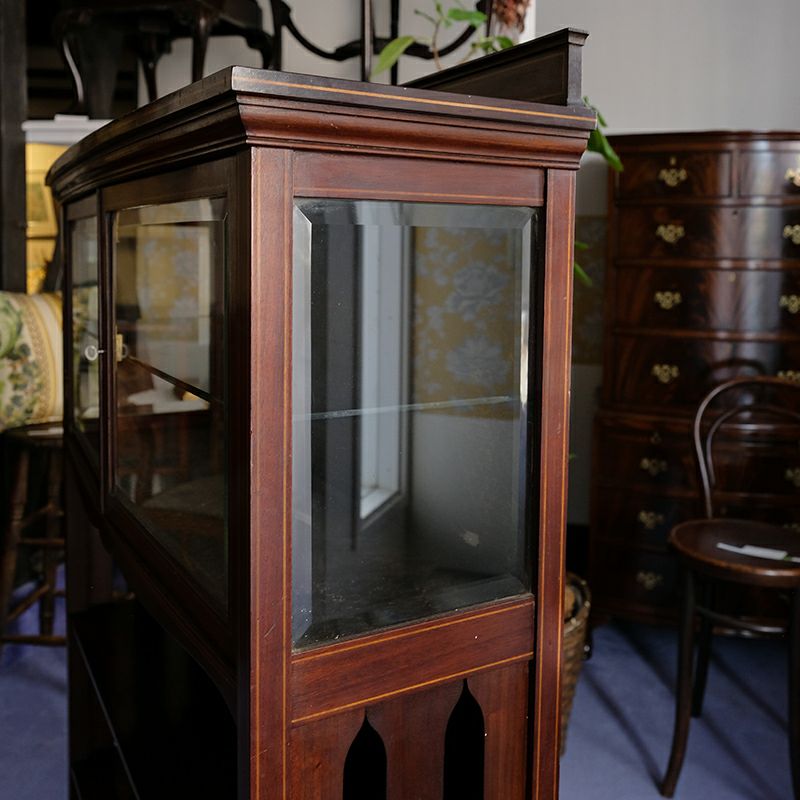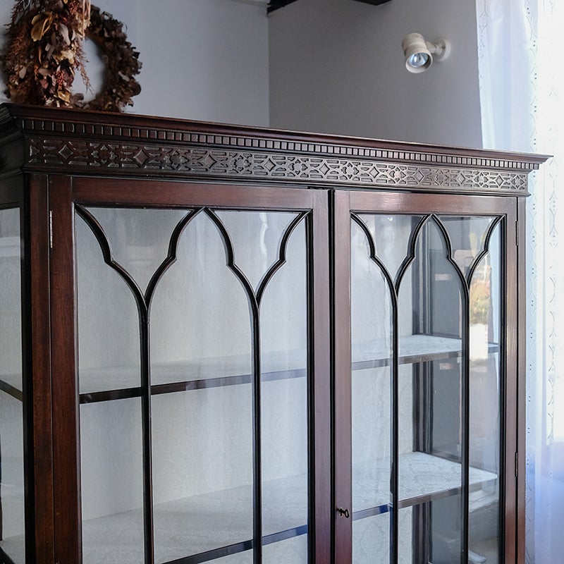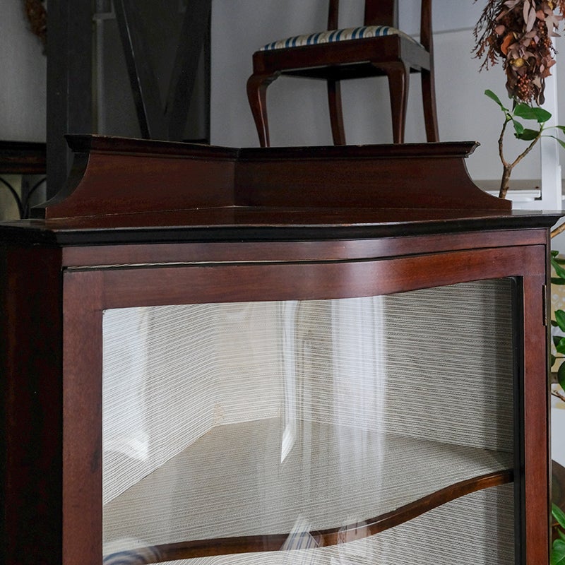 「キャビネット」は、カップボード、キッチンボード、ダイニングボード、サイドボード等の食器類を収納する家具やブックケースと異なり、コレクションを飾ることを目的とした構造からアンティークガラスが三面を飾ります。