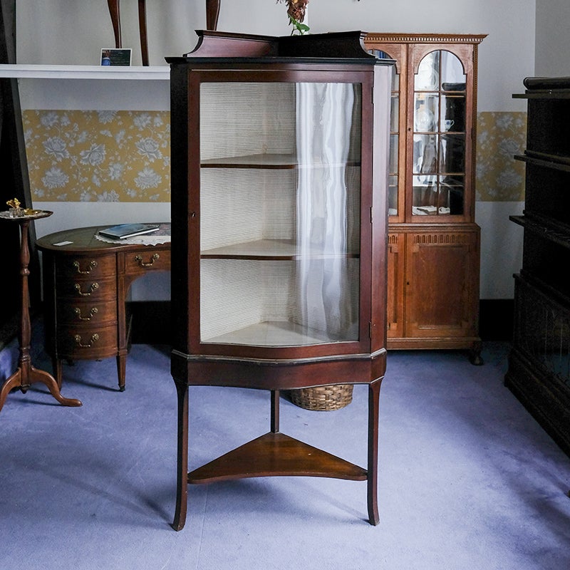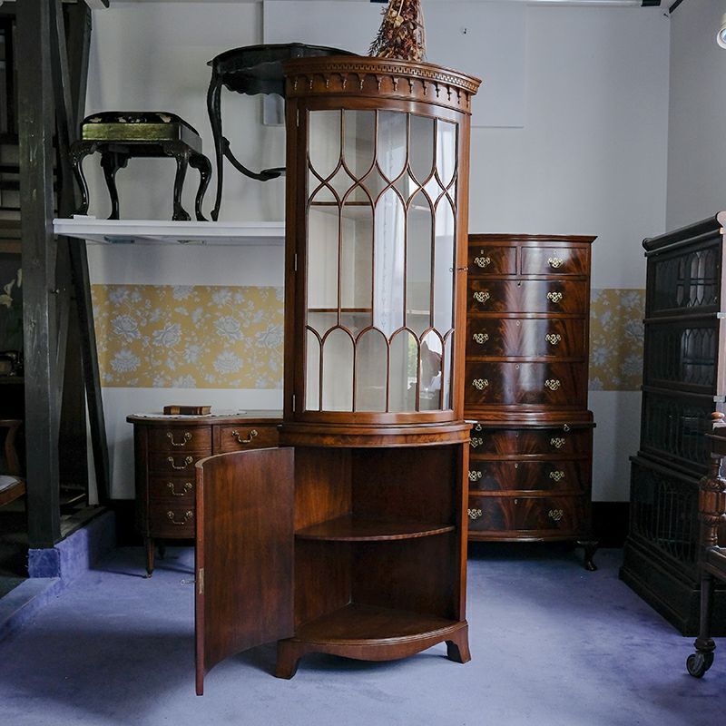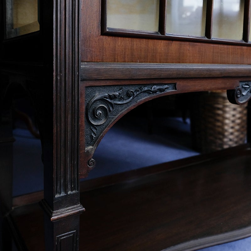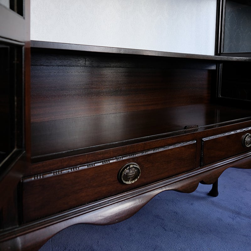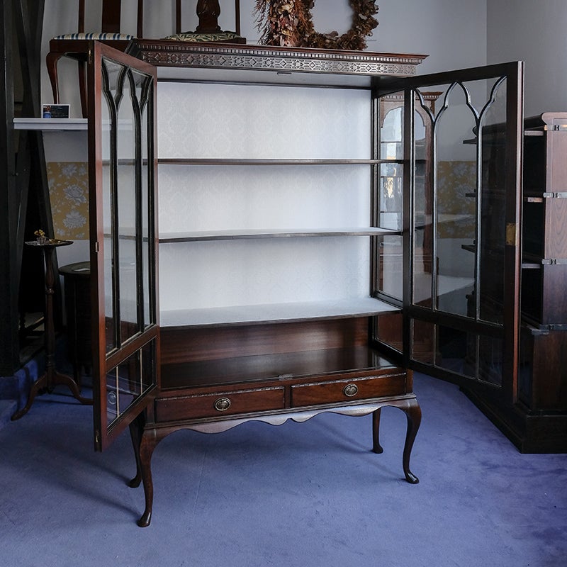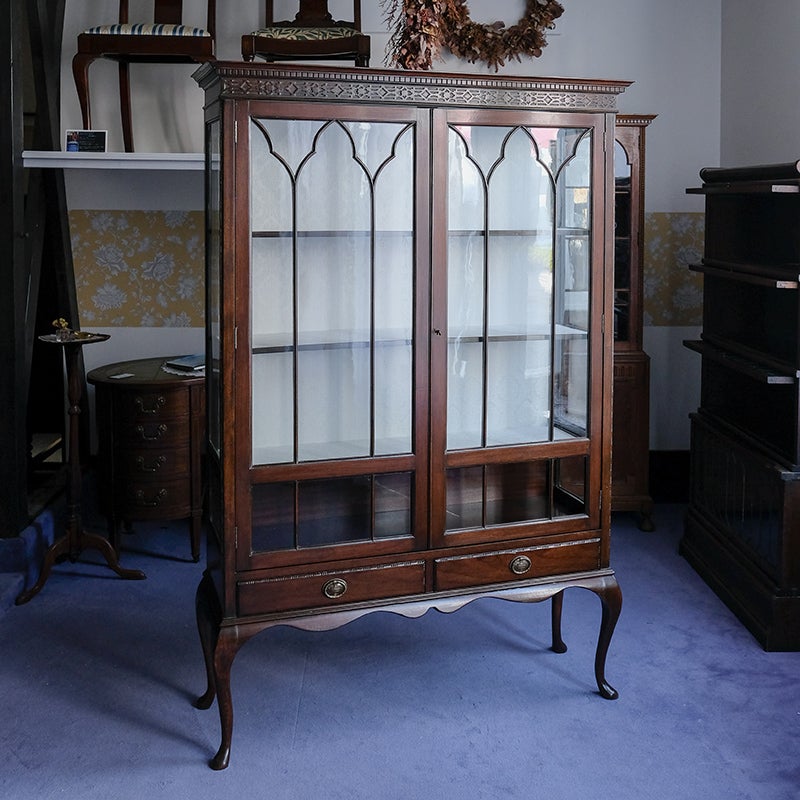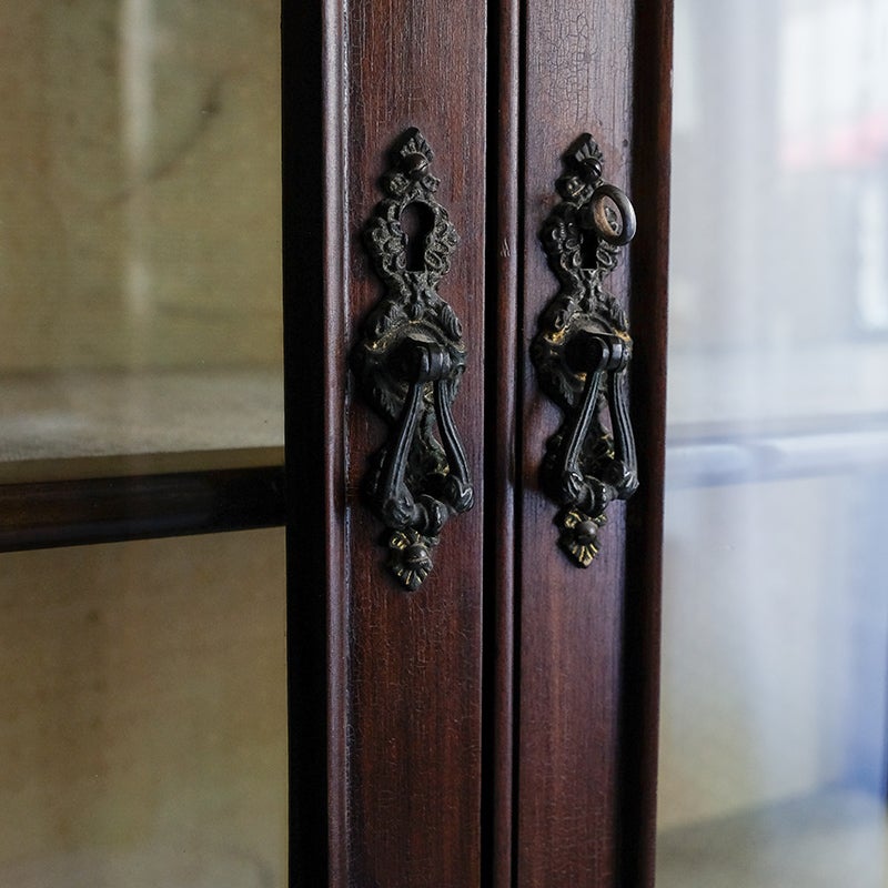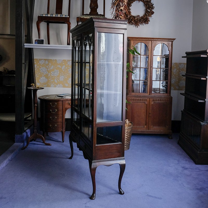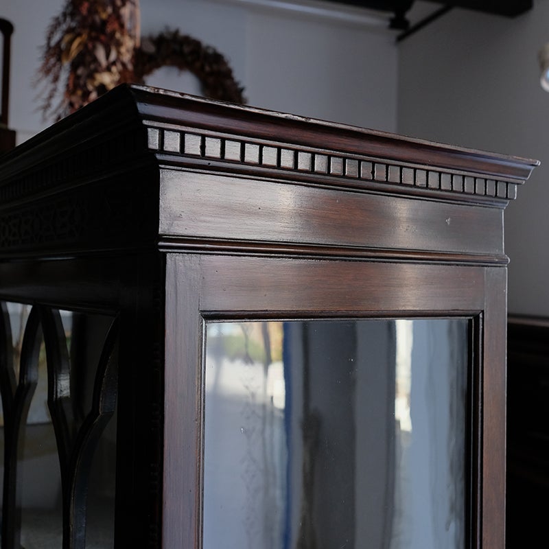 「キャビネット」は、カップボード、キッチンボード、ダイニングボード、サイドボード等の食器類を収納する家具やブックケースと異なり、コレクションを飾ることを目的とした構造からアンティークガラスが三面を飾ります。