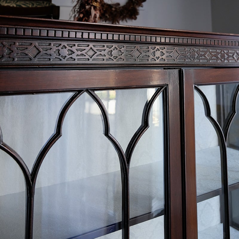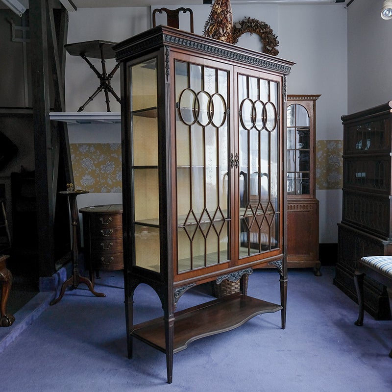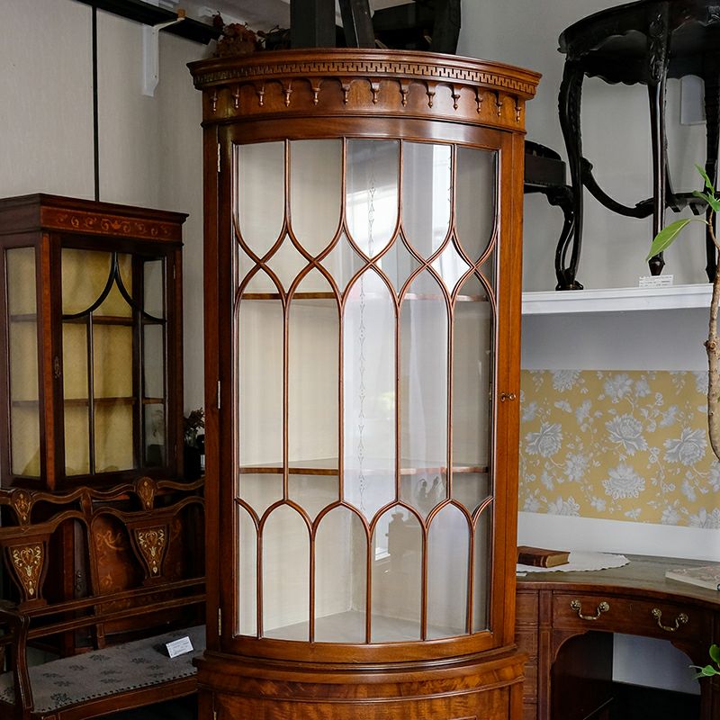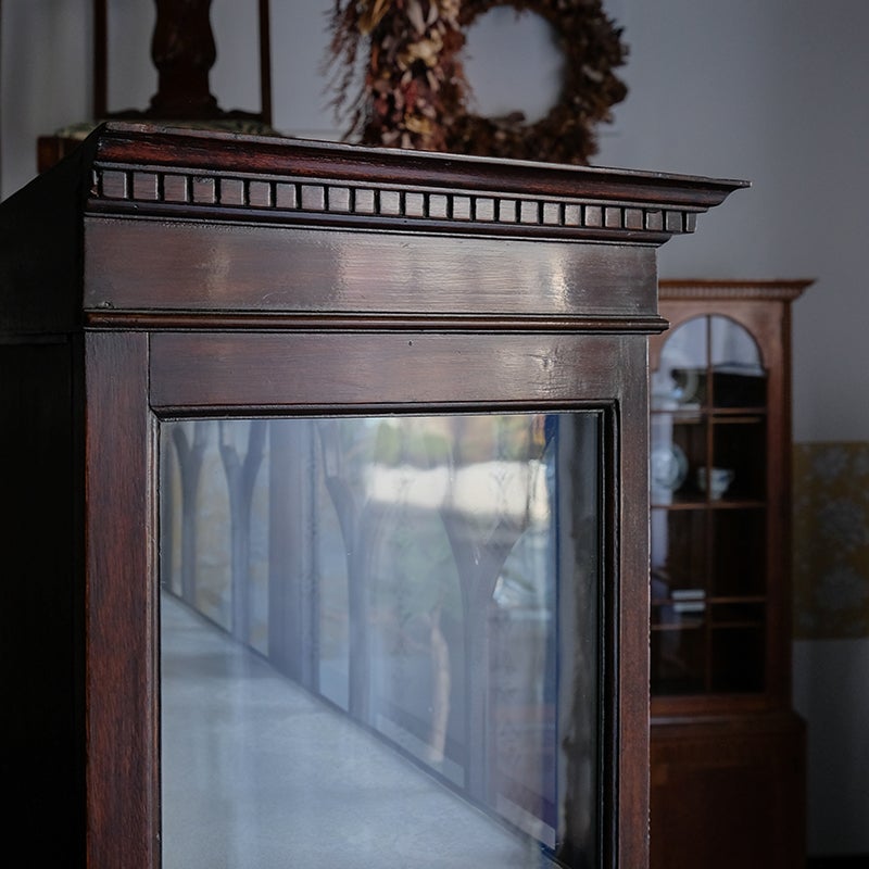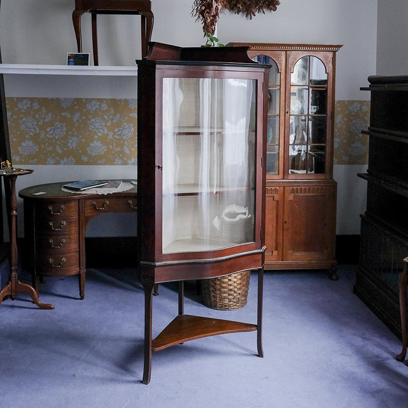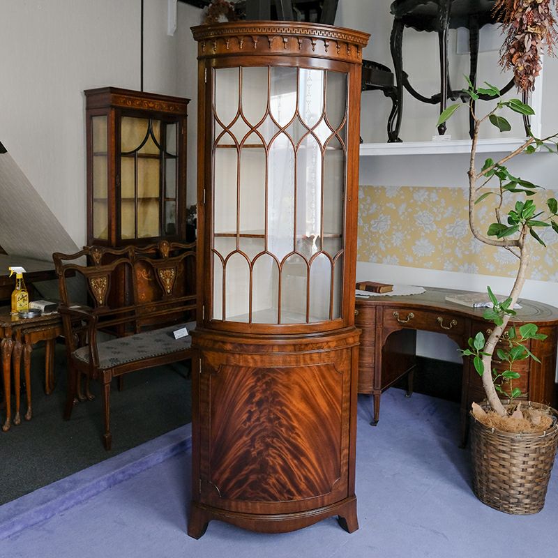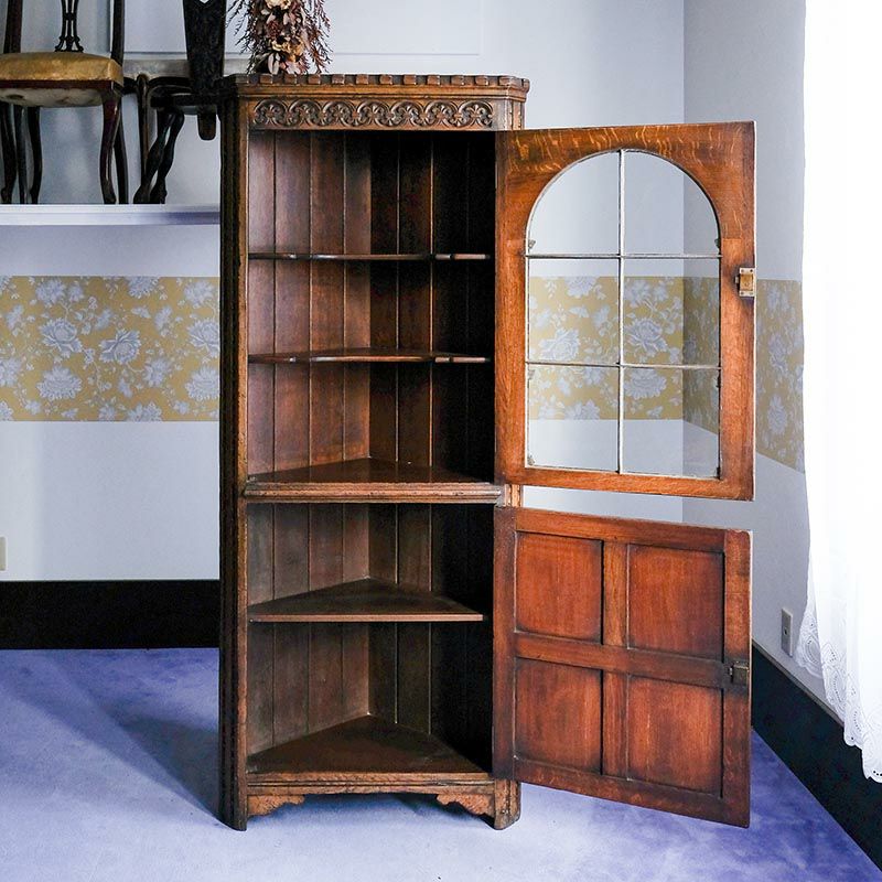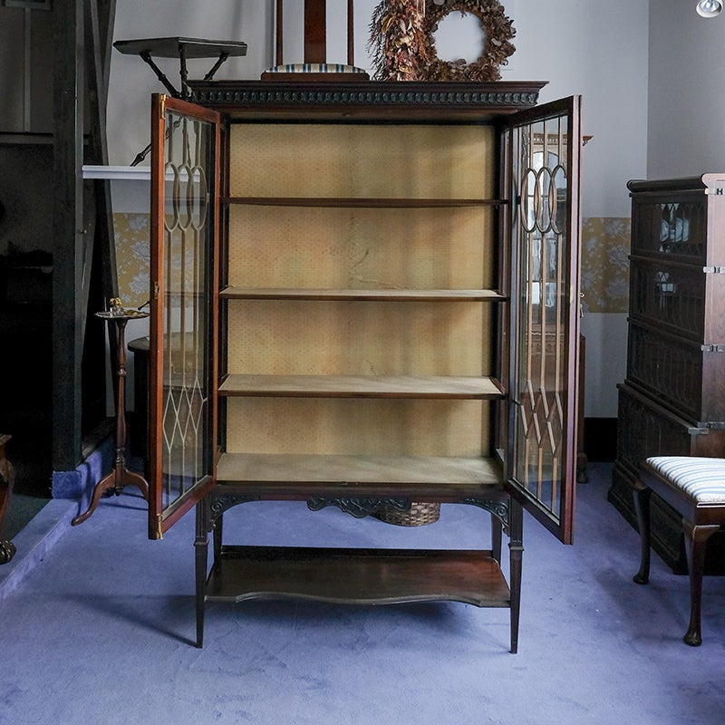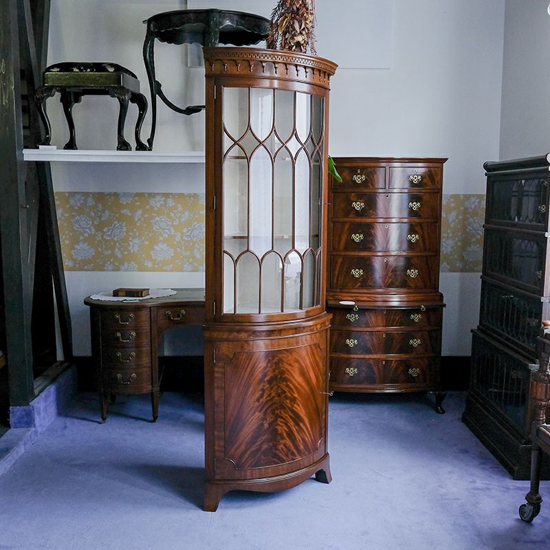「キャビネット」は、カップボード、キッチンボード、ダイニングボード、サイドボード等の食器類を収納する家具やブックケースと異なり、コレクションを飾ることを目的とした構造からアンティークガラスが三面を飾ります。