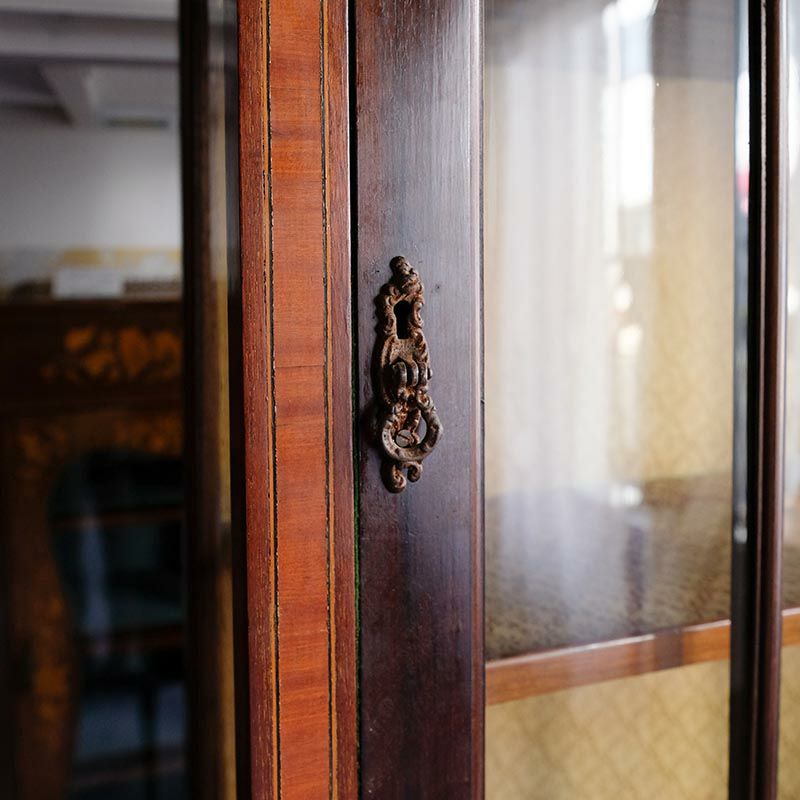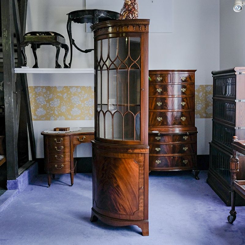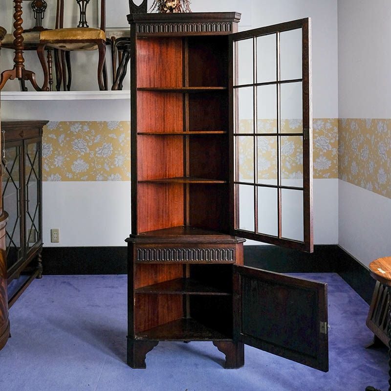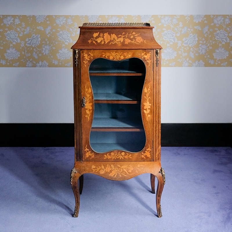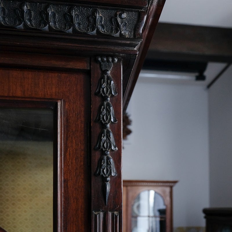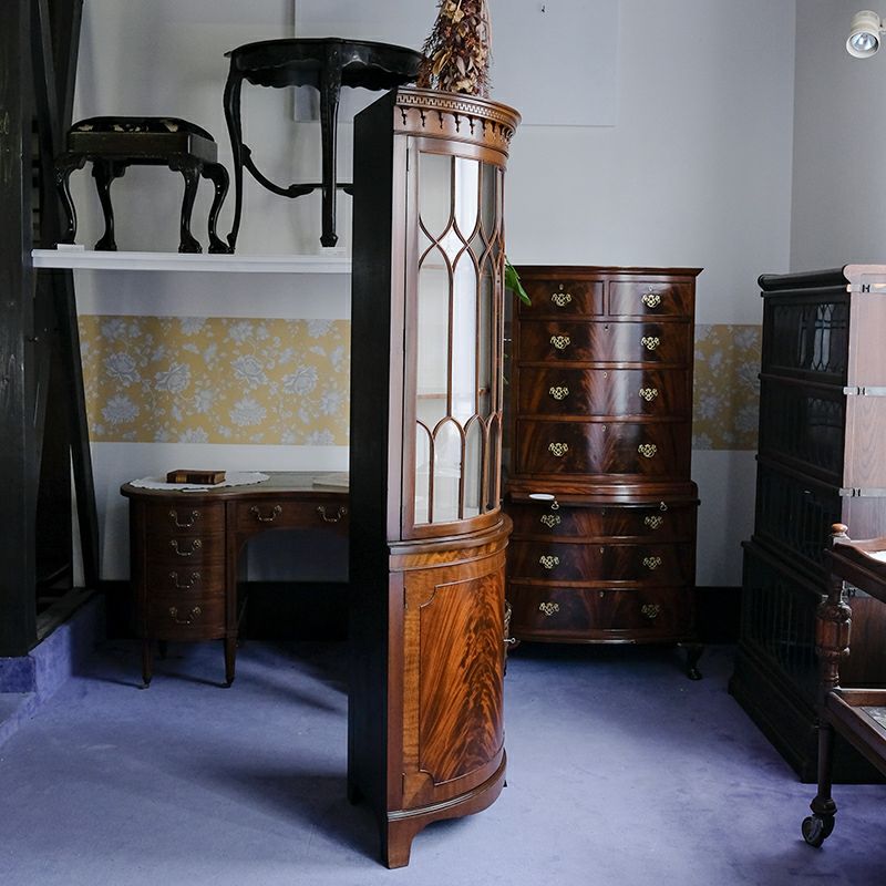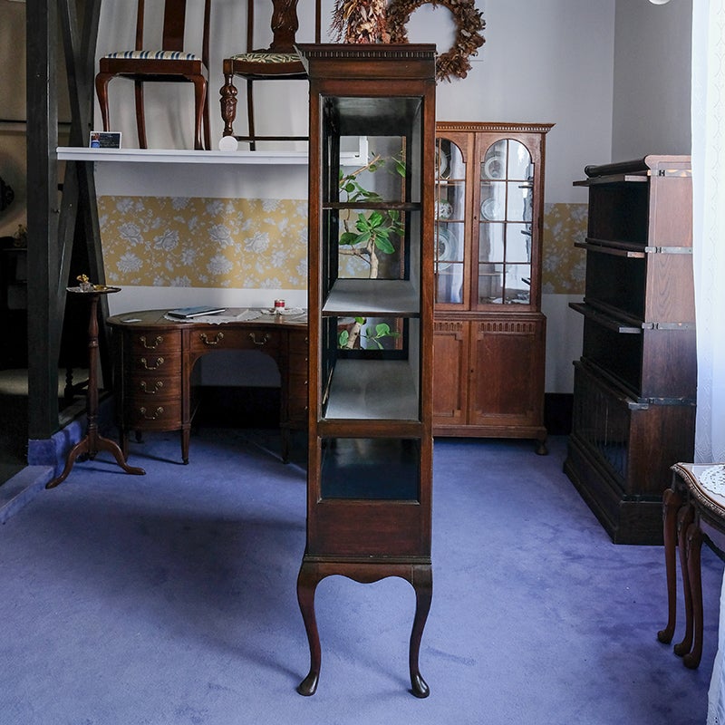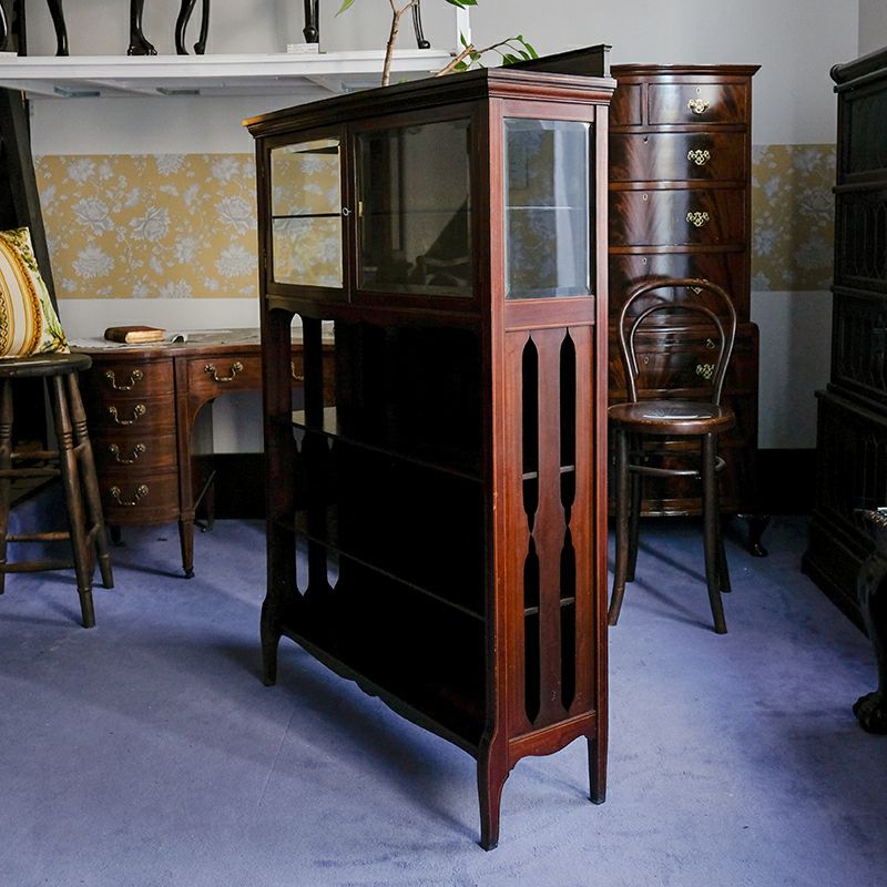 「キャビネット」は、カップボード、キッチンボード、ダイニングボード、サイドボード等の食器類を収納する家具やブックケースと異なり、コレクションを飾ることを目的とした構造からアンティークガラスが三面を飾ります。