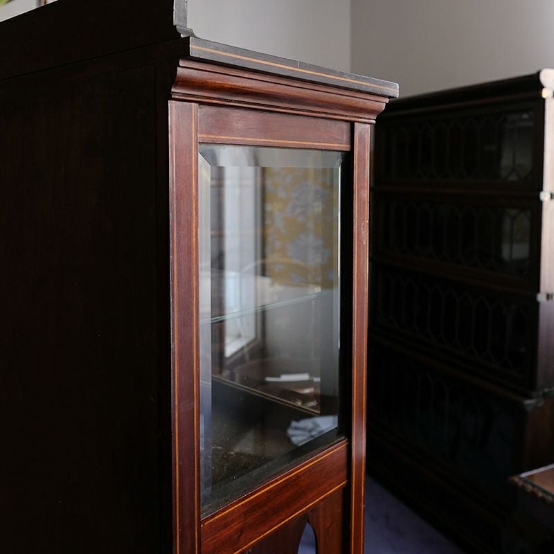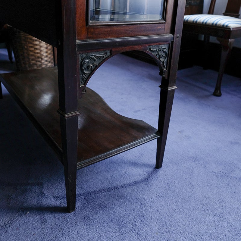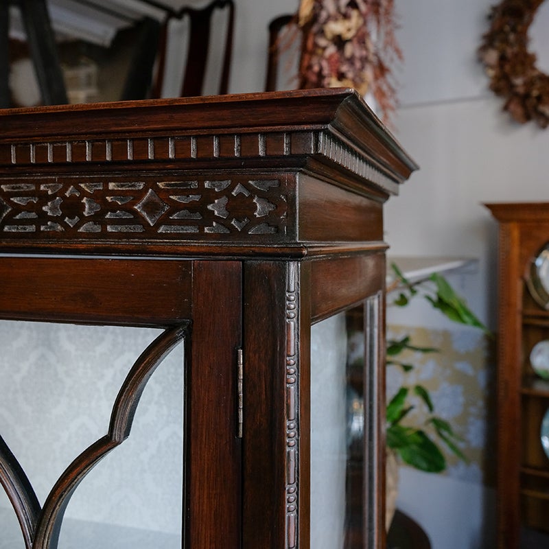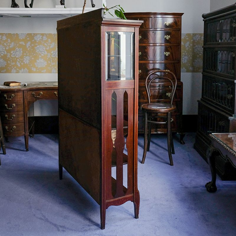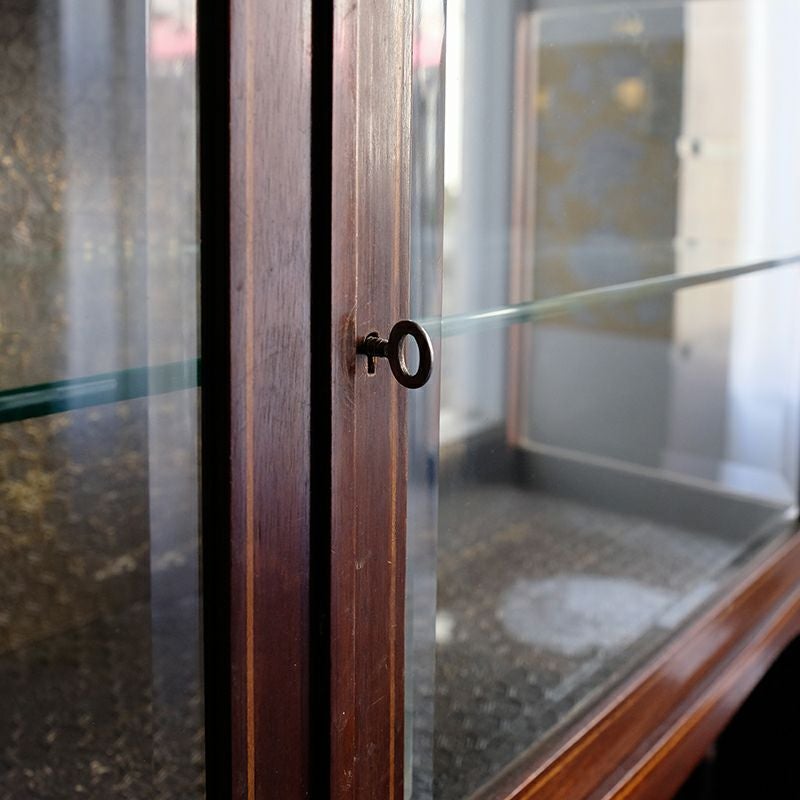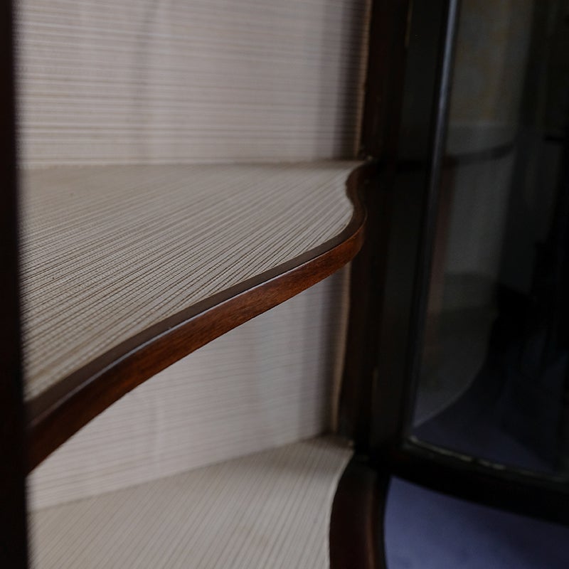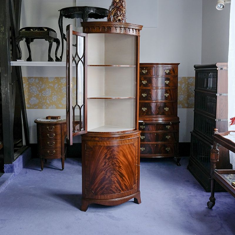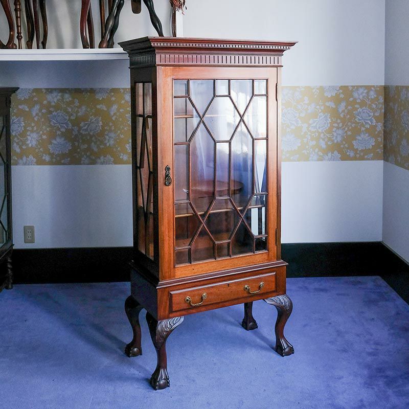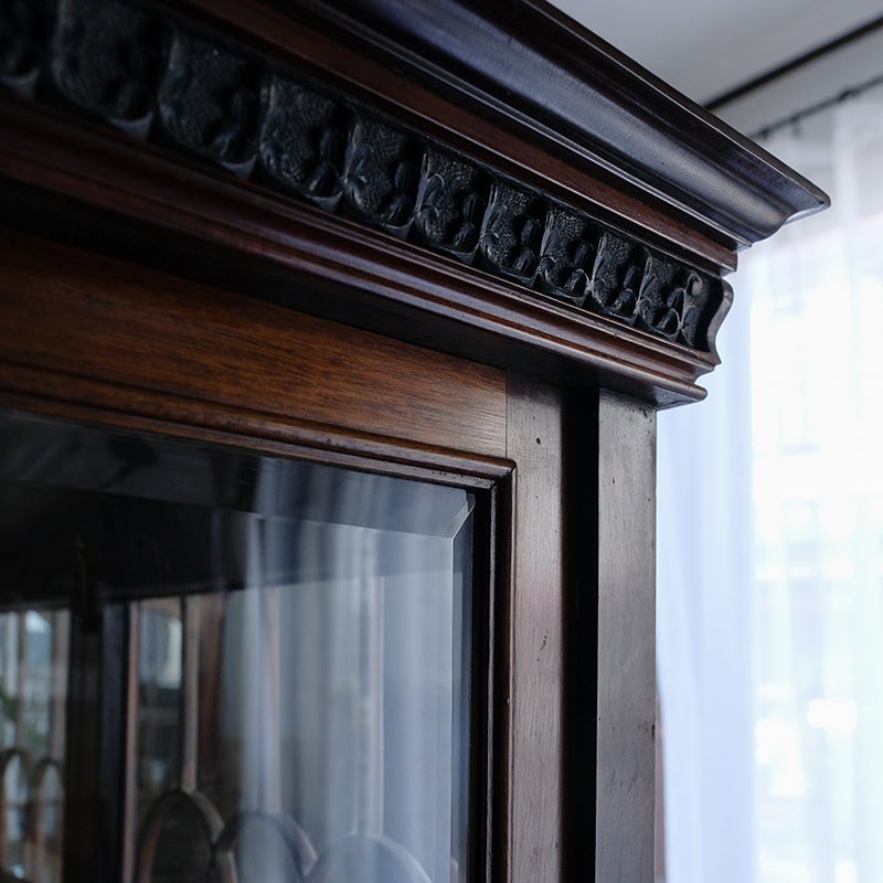 「キャビネット」は、カップボード、キッチンボード、ダイニングボード、サイドボード等の食器類を収納する家具やブックケースと異なり、コレクションを飾ることを目的とした構造からアンティークガラスが三面を飾ります。
