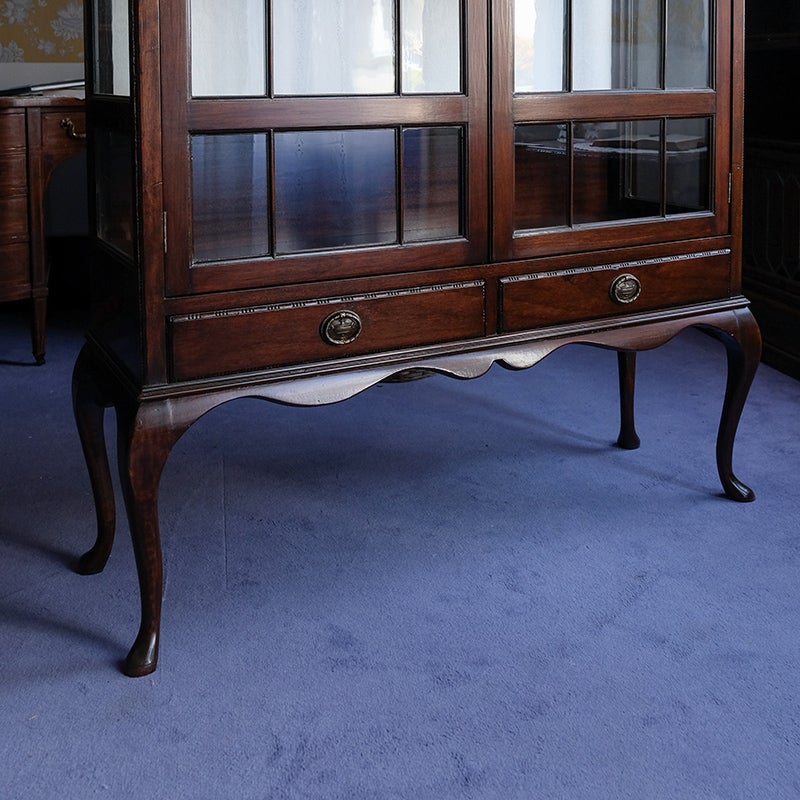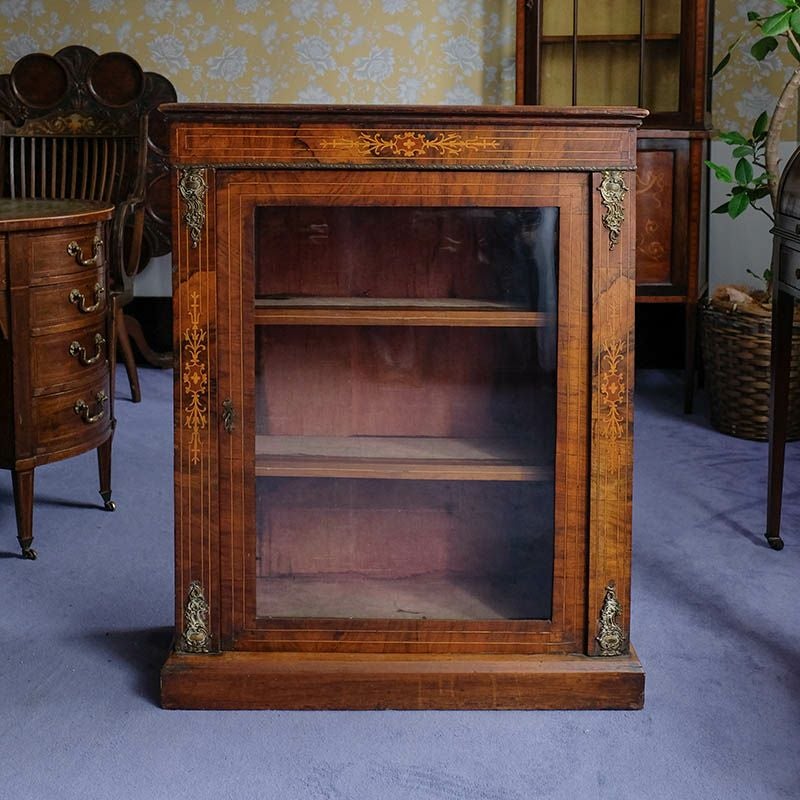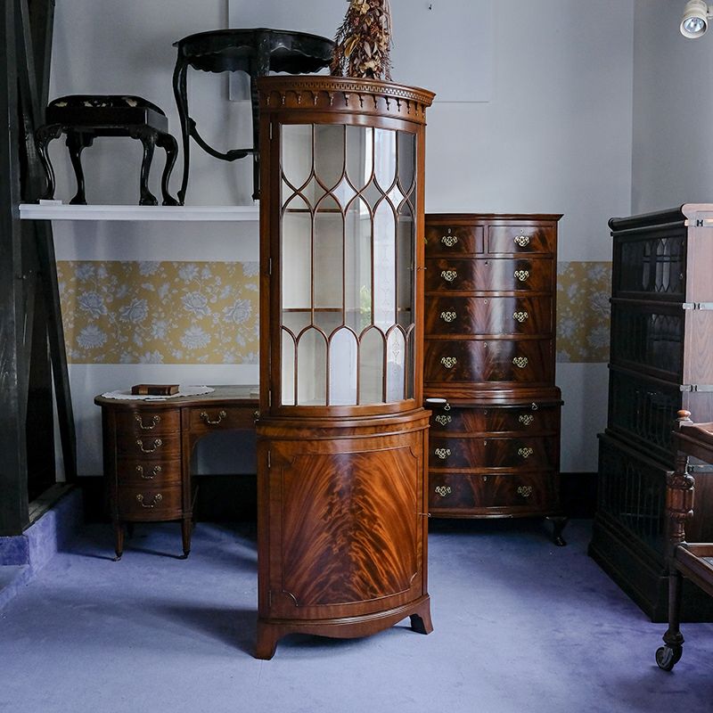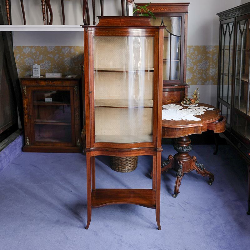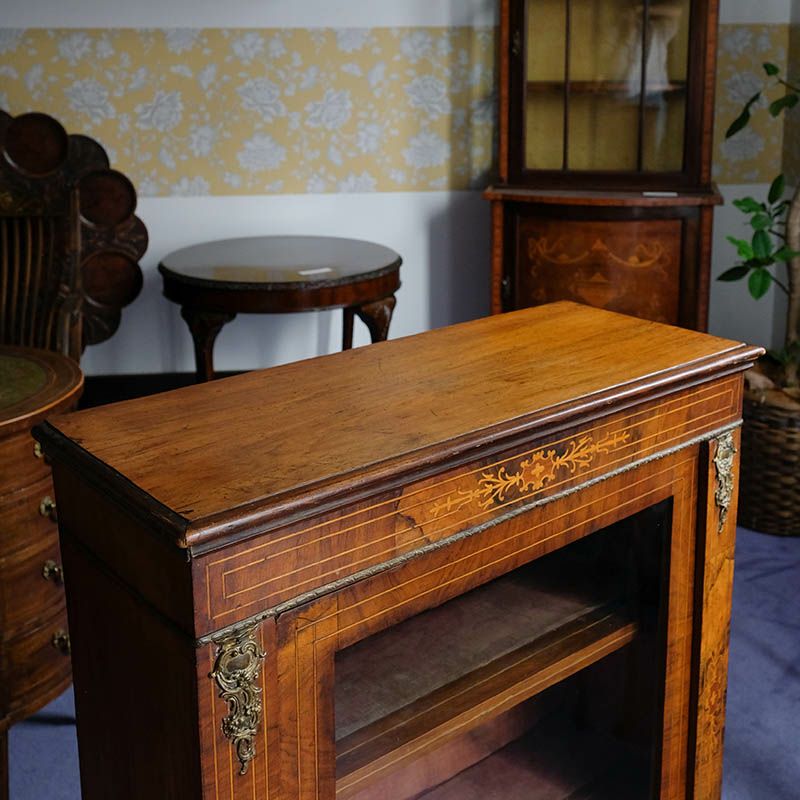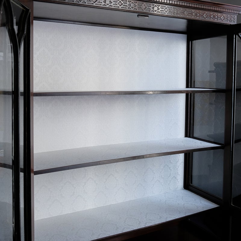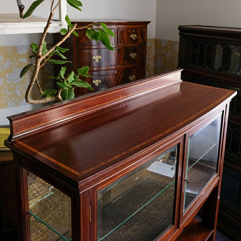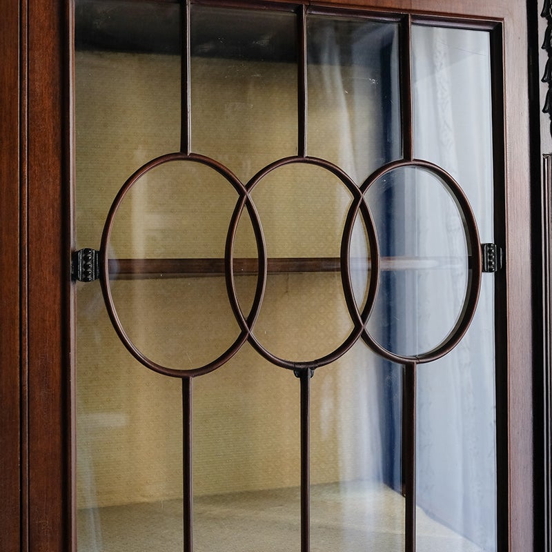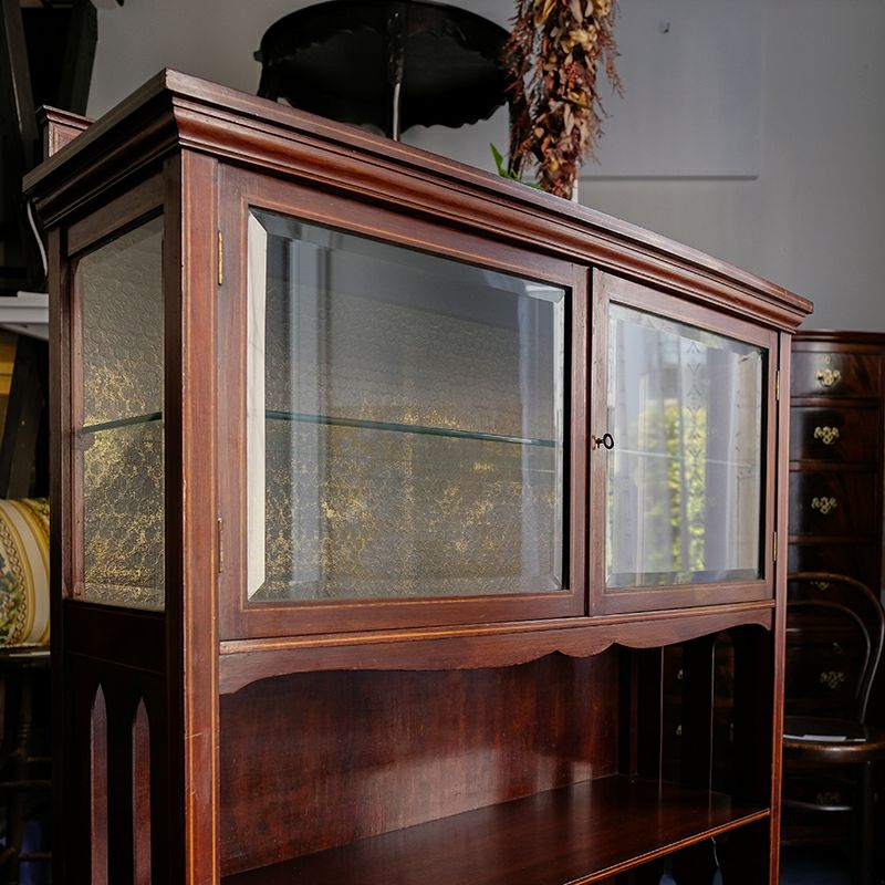 「キャビネット」は、カップボード、キッチンボード、ダイニングボード、サイドボード等の食器類を収納する家具やブックケースと異なり、コレクションを飾ることを目的とした構造からアンティークガラスが三面を飾ります。