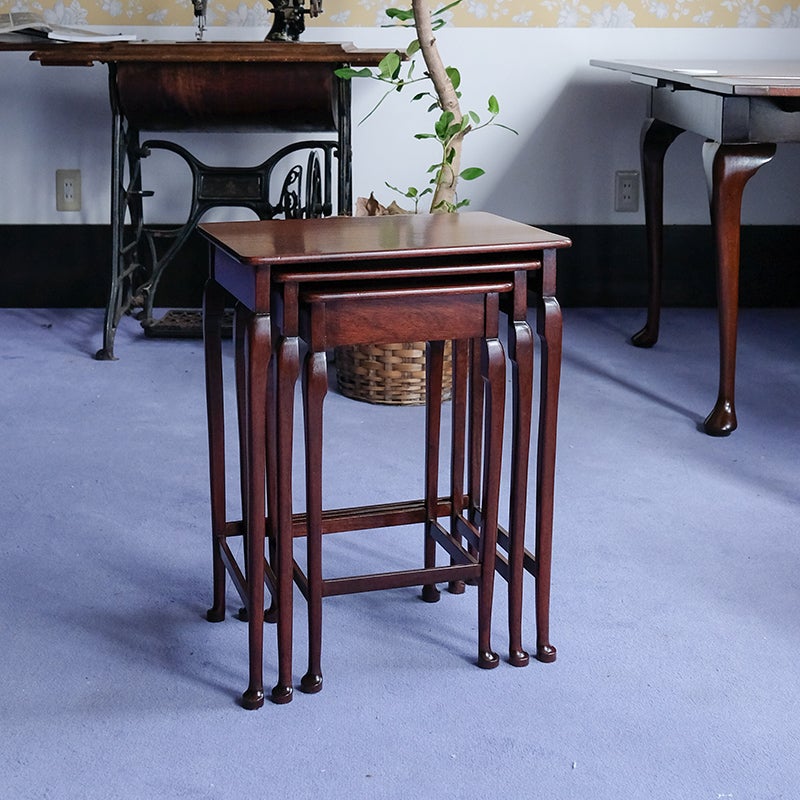 イギリス・英国アンティーク家具、マホガニー製クィーンアンスタイル3段ネストテーブルです。