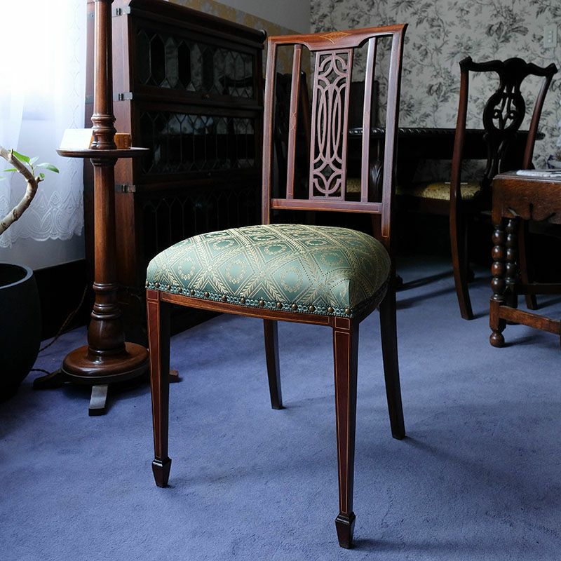 イギリス・英国アンティーク家具、マホガニー製ピアスドフレットワークインレイサロンチェア『Bernadotte/Tassinari & Chatel』です。