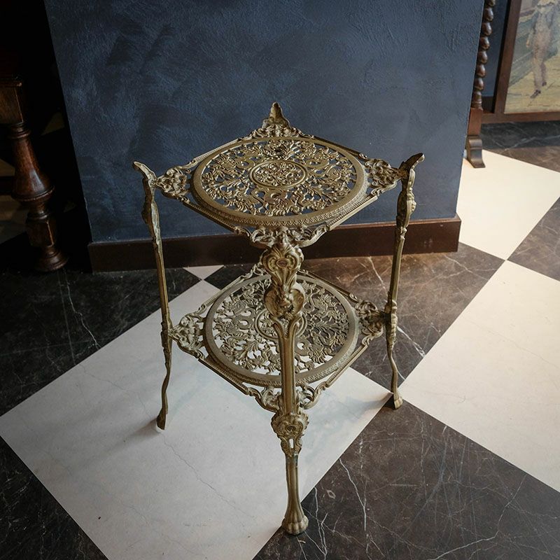 イギリス・英国アンティーク家具「真鍮製2段スタンド」です。 脚先の伝統的フーフット意匠。 植物モチーフの精巧な透かし彫りが施された天板。 デコラティブな装飾が空間を華やかに彩ります。 アンティークならではの美しさ、魅力を是非お楽しみください。