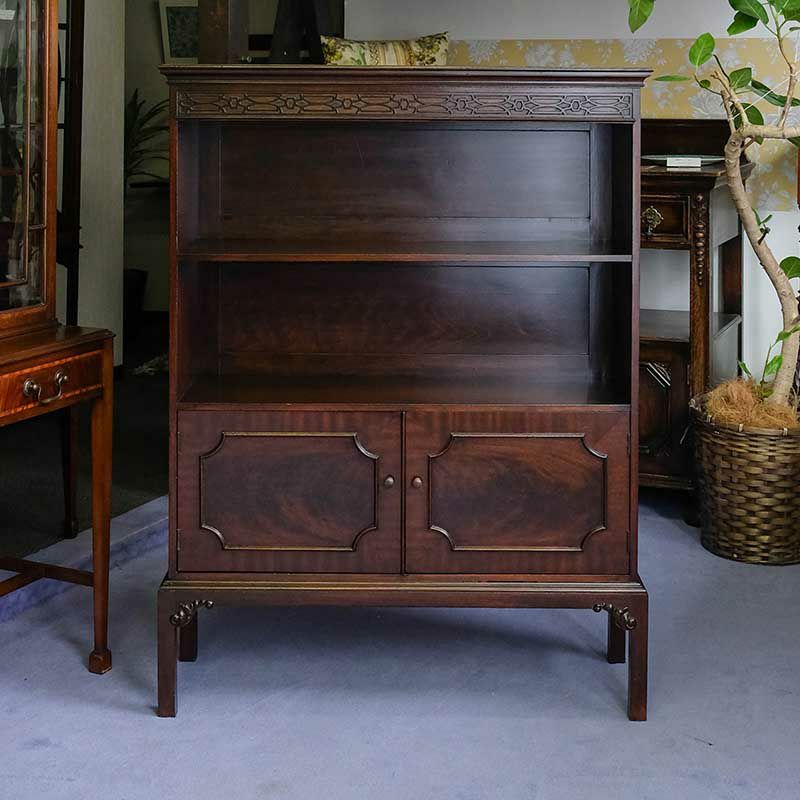 イギリス・英国アンティーク家具「マホガニー製ブラインドフレットワークオープンブックケース」です。