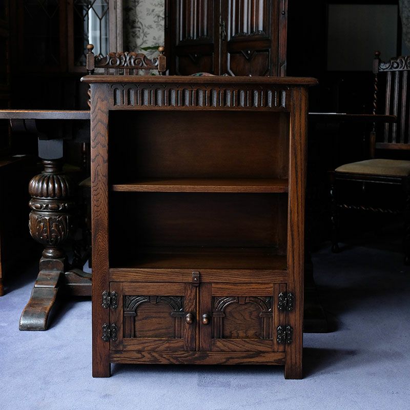 イギリス・英国ヴィンテージ家具「オーク製スモールオープンブックケース/カップボード」です。 オークならではの虎斑目、フリーズや扉にあしらわれたチューダー様式を踏襲する半円アーチ意匠。 丁番金具にまで至る精巧な装飾に目を惹かれる一品です。 その美しさと魅力を是非お楽しみください。