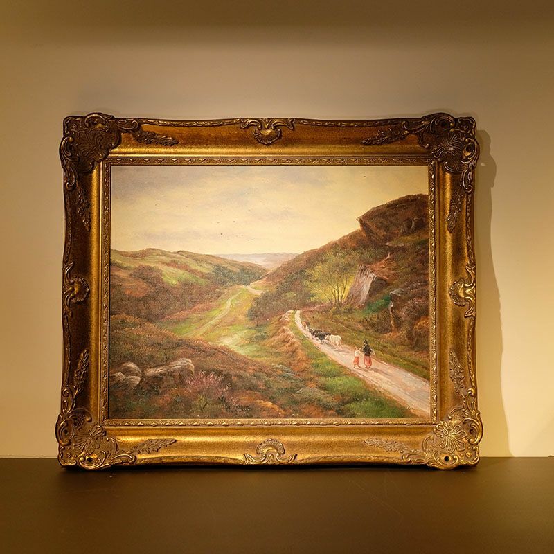 作者不明の油彩画です 雄大な光景が描かれた一枚。 ロココ意匠を思わせるデコラティブなフレームに油絵ならではの趣が目を惹きます。