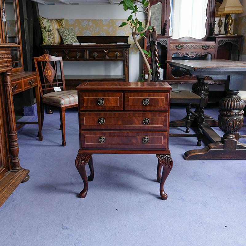 イギリス・英国ヴィンテージ家具「マホガニー製パーケットリーアカンサスカブリオールスモールチェスト」です。