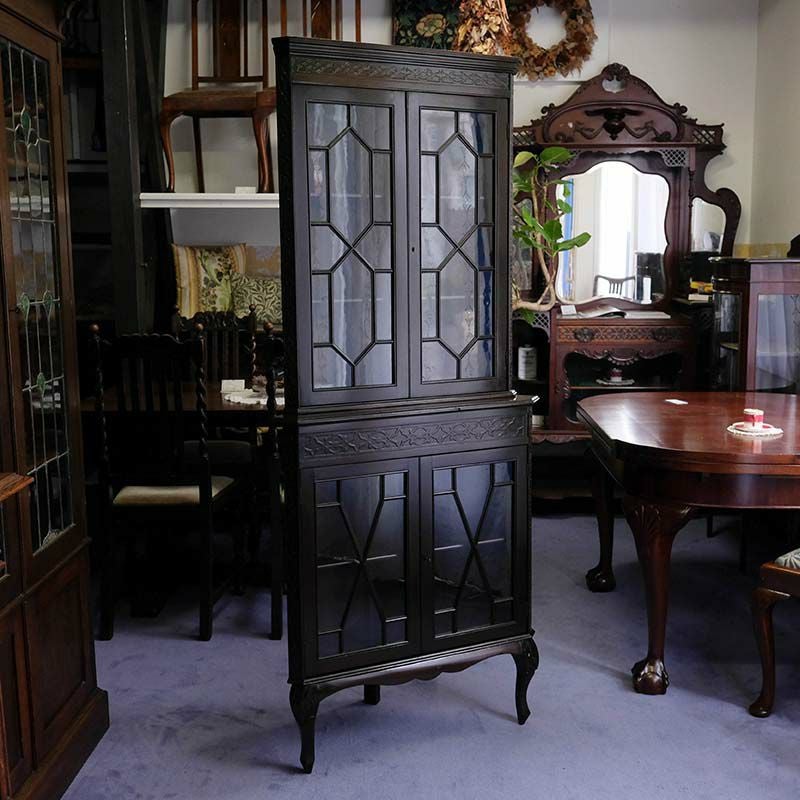 イギリス・英国アンティーク家具「マホガニー製ブラインドフレットコーナーキャビネット」です。 深い味わいのダークマホガニーフレーム。 随所に施された精緻なブラインドフレットワーク。 繊細さが際立つ幾何学的なガラス枠フレーム。 お部屋を歴史の趣で彩るシノワズリースタイルの一品です。 アンティークならではの美しさ、魅力を是非お楽しみください。