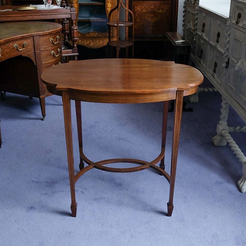 イギリス・英国アンティーク家具、マホガニー製ハーフアークストレッチャー象嵌テーブルです。
