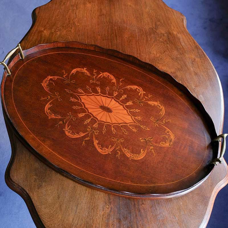 イギリス・英国アンティーク家具、マホガニー製パテラマーケットリートレーです。 トレー中央にあしらわれた精巧なパテラ(皿状意匠)マーケットリー。 天板縁を飾るスカラップギャラリー。 真鍮製ハンドルも美しく、クラシックな趣を醸し出すヴィクトリア朝時代の逸品です。 アンティークならではの魅力を是非お楽しみください。
