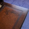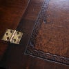 伝統的意匠グリークキーが型押しされた天板レザー。